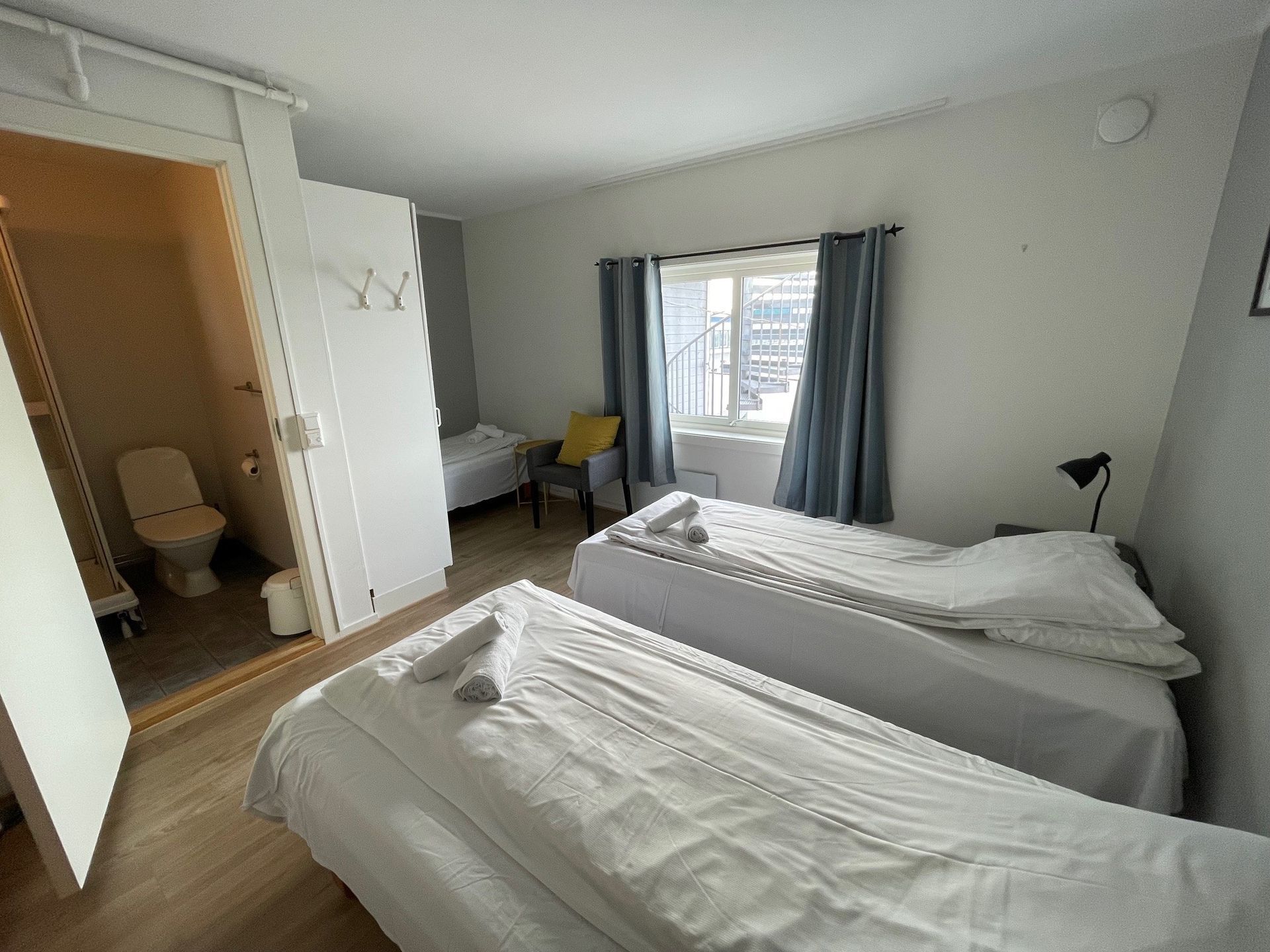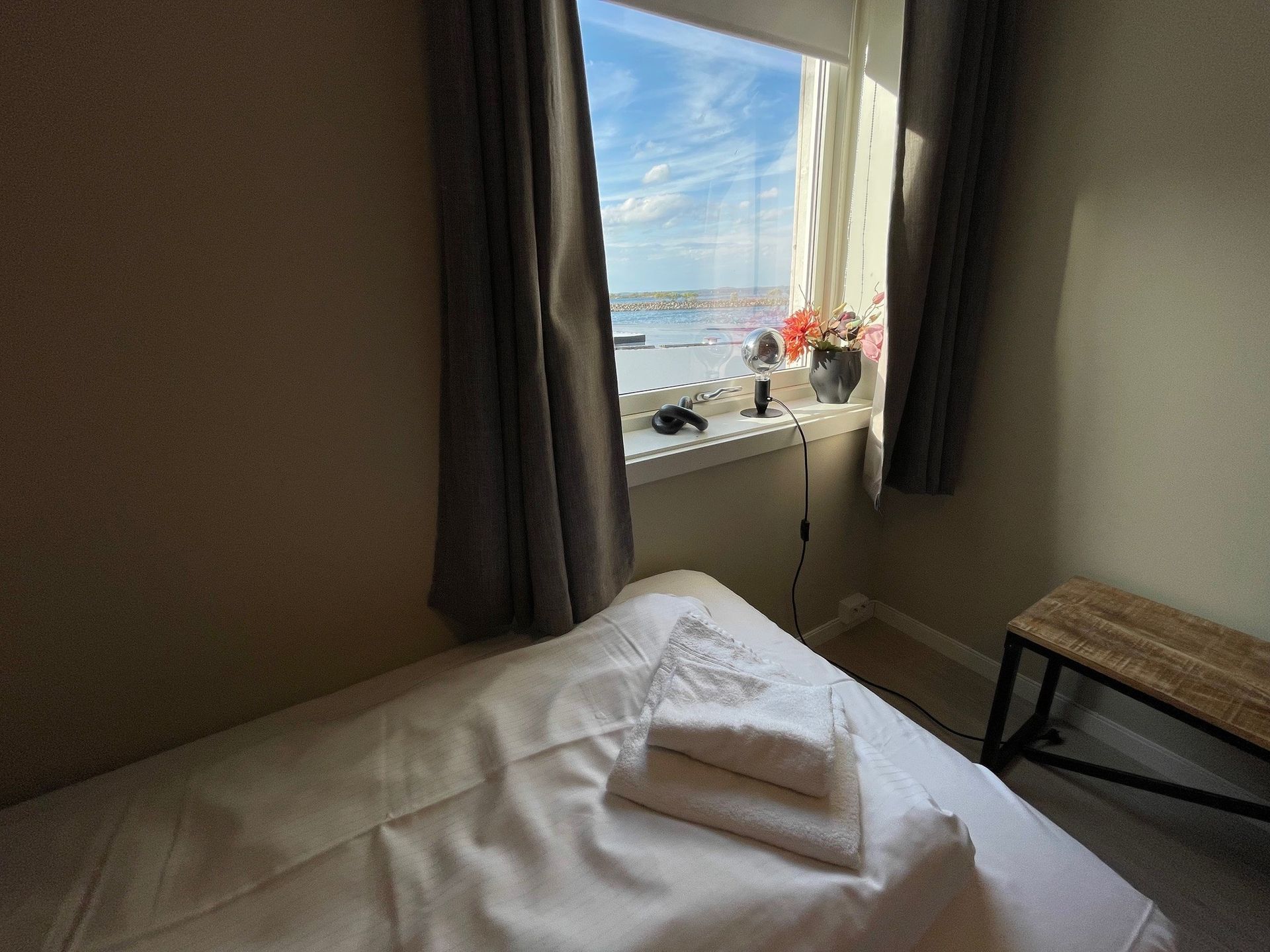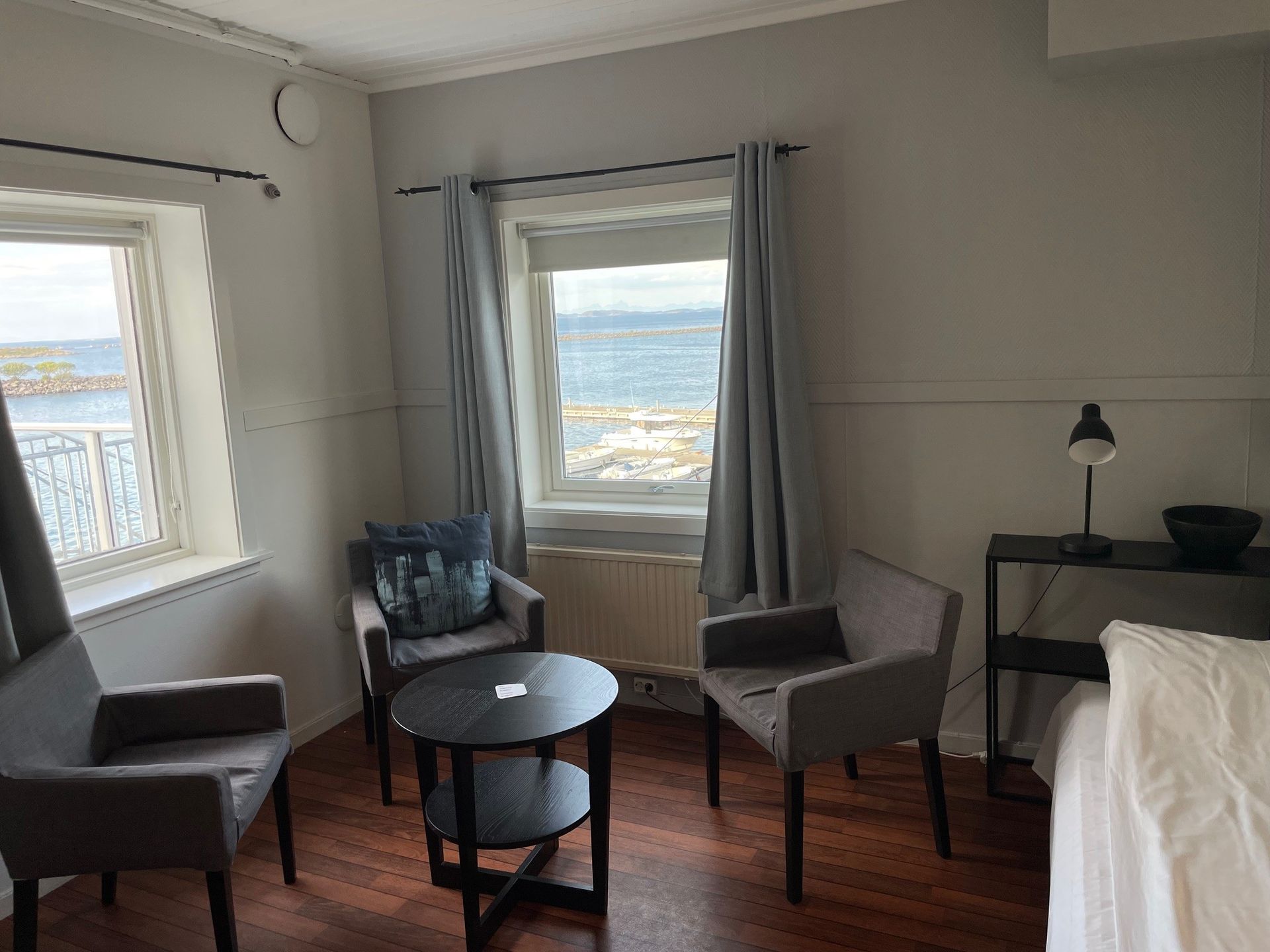 Tremannsrom i romklyngen "Barentshavet" med utsikt mot havet.