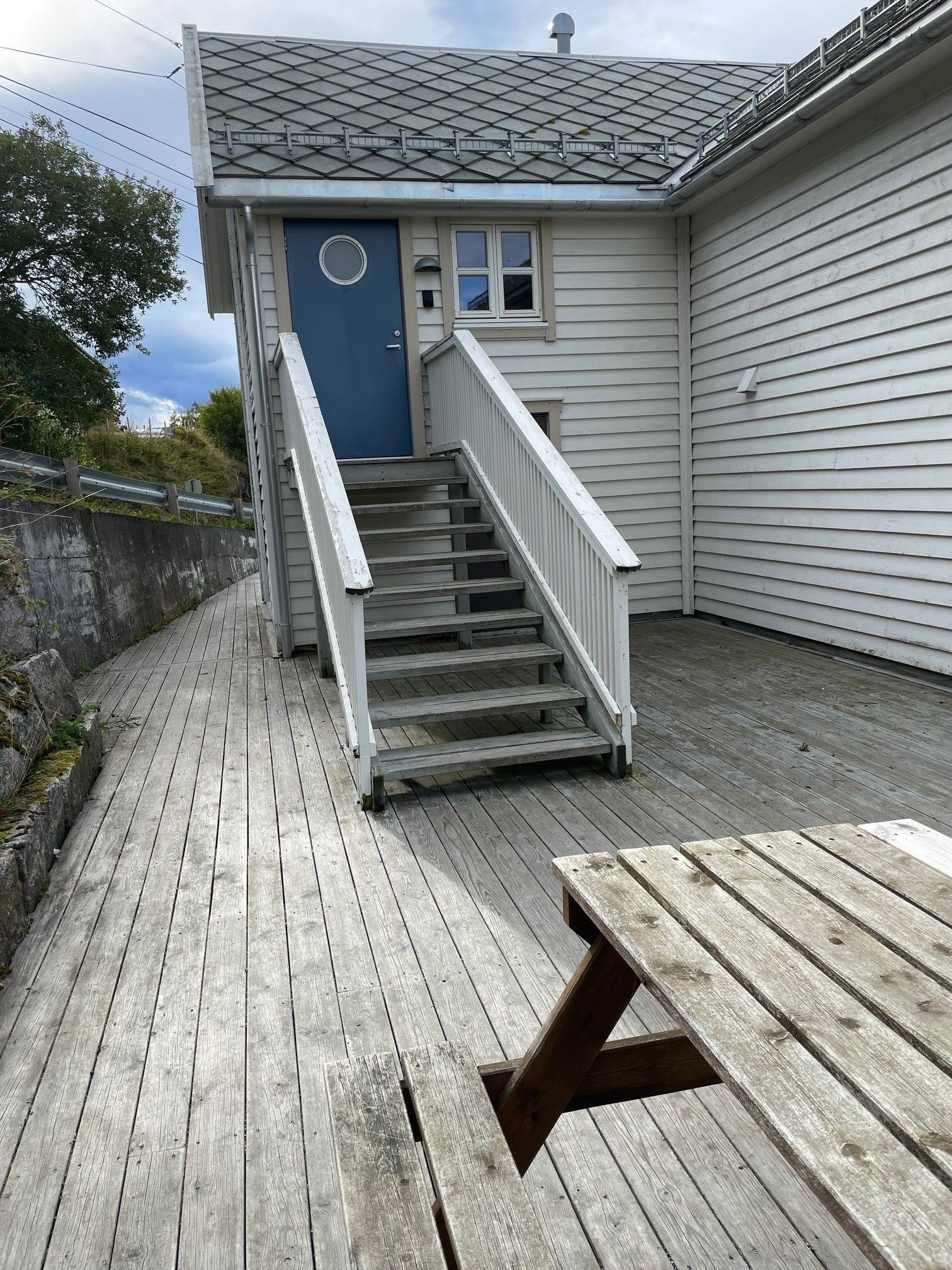 4-sengs leilighet med to soverom, bad, kjøkken, spisebord og salong. Inngang fra bakkeplan rett ut mot bryggen.